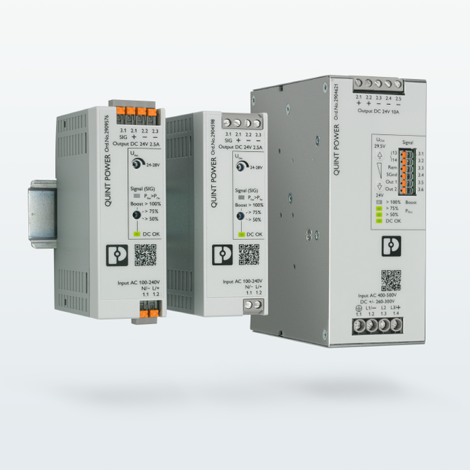 Las fuentes de alimentación QUINT POWER le ofrecen la máxima disponibilidad de la planta gracias a su SFB Technology y la interfaz NFC integrada para la configuración personalizada.
