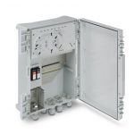 Smart Camera Box es un switch PoE para exteriores con fuente de alimentación integrada, protección contra sobretensiones, caja de empalmes para cables de fibra óptica y un riel para accesorios adicionales.